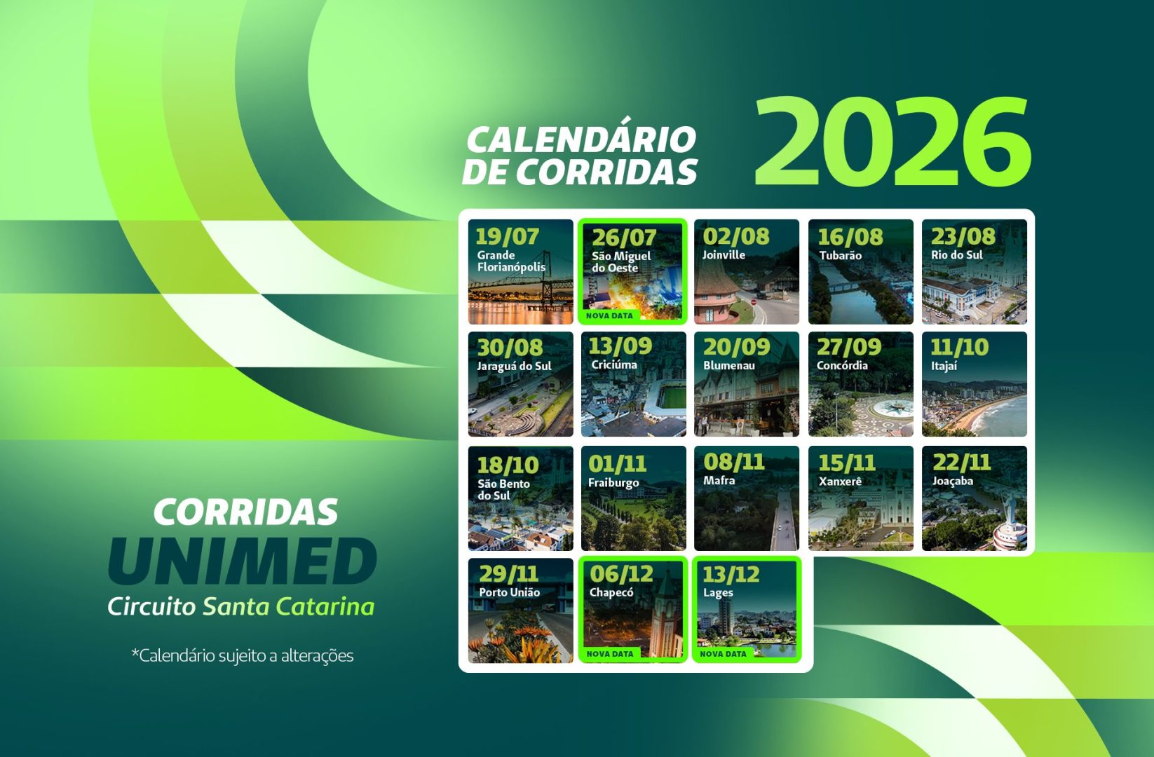O Circuito de Corridas Unimed é o maior circuito de corridas de SC! São realizadas 18 etapas, em todas as regiões do estado! Confira o calendário completo: Clique aqui!